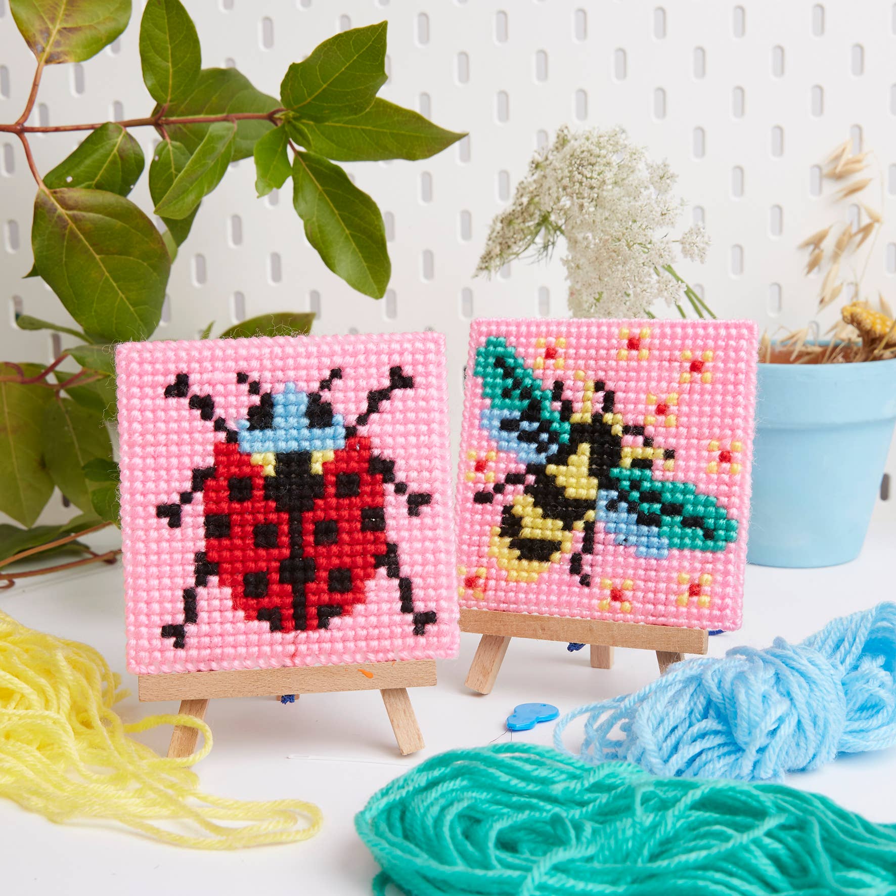 CONTENTS This beginners starter kit includes everything needed to make 2 fun designs in a 'Bugs' theme, including all the sewing accessories: yarn, canvas, chunky needle and threads. Also includes full instructions and chart.