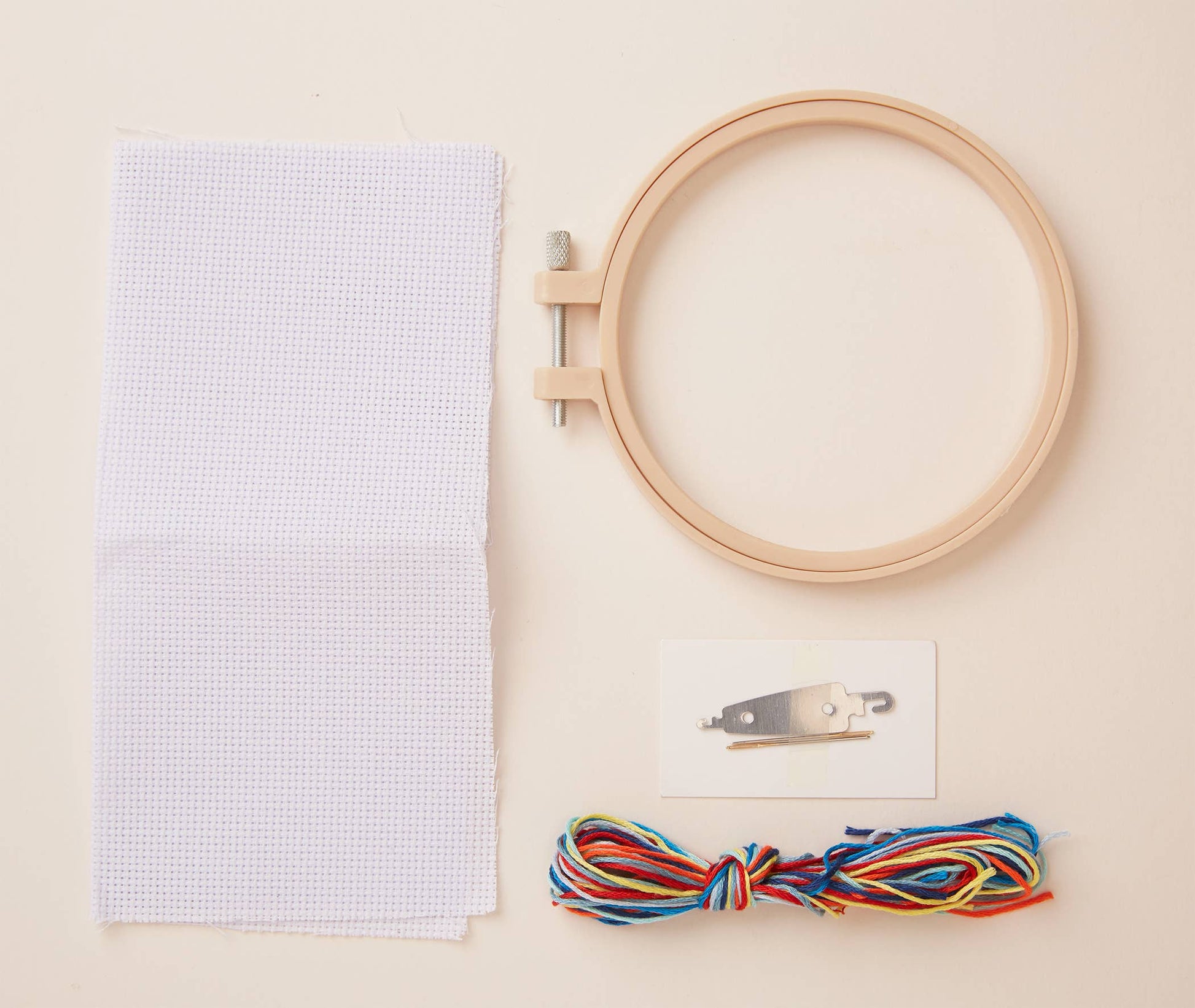 CONTENTS 125mm plastic hoop, 8 x threads, stitching fabric, 2 x needles, threader, instructions, and a cross stitch chart. A perfect DIY craft kit for beginners, all supplies included.